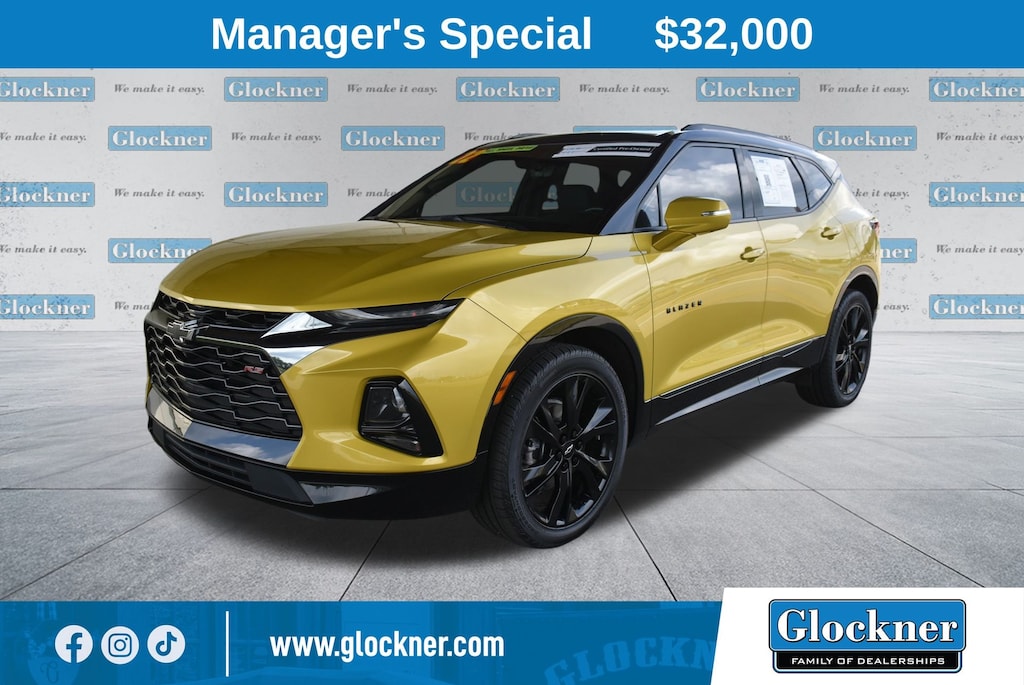Glockner Chrysler Dodge Jeep Ram of Ashland is proud to offer this wonderful-looking 2022 Chevrolet Blazer in Nitro Yellow Metallic. This 2022 Chevrolet Blazer has passed our comprehensive inspection and comes with the following features; Cargo Package (LPO) (Retractable Cargo Shade and Vertical Cargo Net (LPO)), Driver Confidence II Package (Adaptive Cruise Control, Enhanced Automatic Emergency Braking, HD Surround Vision, LED Headlamps, Rear Camera Mirror, Rear Camera Mirror Washer, Safety Alert Seat, and Wireless Charging), Enhanced Convenience Package (Heated Rear Outboard Seating Positions, Memory Settings For Driver Seat & Exterior Mirrors, Power Tilt & Telescoping Steering Column, and Ventilated Driver & Front Passenger Seats), Interior Protection Package (LPO) (Premium All-Weather Cargo Mat (LPO) and Premium All-Weather Floor Mats), Preferred Equipment Group 1RS (Heated Driver & Front Passenger Seats and Heated Steering Wheel), Storage Optimization Package (LPO) (Collapsible Cargo Area Organizer (LPO) and Front Console Organizer), Glockner Certified Certified, AWD, 3.49 Final Drive Axle Ratio, 4-Wheel Disc Brakes, 6 Speakers, 6-Speaker Audio System Feature, 6-Way Power Front Passenger Seat Adjuster, ABS brakes, Air Conditioning, Alloy wheels, AM/FM radio: SiriusXM with 360L, Apple CarPlay/Android Auto, Auto High-beam Headlights, Auto-dimming door mirrors, Auto-dimming Rear-View mirror, Automatic temperature control, Black 2-Tone Roof, Black Lug Nut & Wheel Lock Kit (LPO), Brake assist, Bumpers: body-color, Child-Seat-Sensing Airbag, Compass, Delay-off headlights, Driver door bin, Driver vanity mirror, Dual front impact airbags, Dual front side impact airbags, Electronic Stability Control, Emergency communication system: OnStar and Chevrolet connected services capable, Exterior Parking Camera Rear, Four wheel independent suspension, Front anti-roll bar, Front Bucket Seats, Front Center Armrest, Front dual zone A/C, Front reading lights, Fully automatic headlights, Garage door transmitter, Heated door mirrors, Heated front seats, Heated steering wheel, High-Intensity Discharge Headlights, Illuminated entry, Knee airbag, Leather Shift Knob, Low tire pressure warning, Navigation System, Not Equipped w/Driver & Fr Passenger Heated Seats, Not Equipped w/Heated Rear Outboard Seats, Not Equipped w/Heated Steering Wheel, Occupant sensing airbag, Outside temperature display, Overhead airbag, Overhead console, Panic alarm, Passenger door bin, Passenger vanity mirror, Pedal Cover Set, Perforated Leather-Appointed Seat Trim, Power door mirrors, Power driver seat, Power Liftgate, Power Panoramic Tilt-Sliding Sunroof, Power passenger seat, Power steering, Power windows, Radio data system, Radio: Chevrolet Infotainment 3 Plus System, Rear anti-roll bar, Rear reading lights, Rear seat center armrest, Rear window defroster, Rear window wiper, Remote keyless entry, Ride & Handling Suspension, Security system, SiriusXM w/360L, Speed control, Speed-sensing steering, Split folding rear seat, Spoiler, Steering wheel mounted audio controls, Tachometer, Telescoping steering wheel, Tilt steering wheel, Traction control, Trip computer, Turn signal indicator mirrors, Variably intermittent wipers, Voltmeter, Wheels: 20" Dark Android Machined-Face Aluminum, and Wheels: 21" Gloss Black Aluminum.