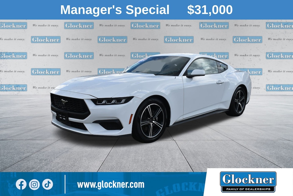 Glockner Ford Southpoint is proud to offer this terrific 2024 Ford Mustang in Oxford White. This 2024 Ford Mustang has passed our comprehensive inspection and comes with the following features; Equipment Group 200A Standard Package, Glockner Certified Certified, 4-Wheel Disc Brakes, 9 Speakers, ABS brakes, ActiveX Bucket Seats, Air Conditioning, Alloy wheels, AM/FM radio: SiriusXM with 360L, AM/FM Stereo, Auto High-beam Headlights, Auto-dimming Rear-View mirror, Automatic temperature control, Brake assist, Bumpers: body-color, Climate Controlled Heated/Cooled Front Seats, Compass, Delay-off headlights, Driver door bin, Driver vanity mirror, Dual front impact airbags, Dual front side impact airbags, Electronic Stability Control, Emergency communication system: 911 Assist, Exterior Parking Camera Rear, Four wheel independent suspension, Front anti-roll bar, Front Bucket Seats, Front Center Armrest, Front dual zone A/C, Front reading lights, Fully automatic headlights, HD Radio, Heated door mirrors, Heated front seats, Heated steering wheel, Illuminated entry, Knee airbag, Leather Shift Knob, Leather steering wheel, Occupant sensing airbag, Outside temperature display, Overhead airbag, Overhead console, Panic alarm, Passenger door bin, Passenger vanity mirror, Power door mirrors, Power driver seat, Power passenger seat, Power steering, Power windows, Radio data system, Rain sensing wipers, Rear anti-roll bar, Rear Parking Sensors, Rear window defroster, Remote keyless entry, SiriusXM w/360L, Speed control, Speed-sensing steering, Speed-Sensitive Wipers, Split folding rear seat, Spoiler, Sport steering wheel, Steering wheel mounted audio controls, SYNC 4.0 QNX, Tachometer, Telescoping steering wheel, Tilt steering wheel, Traction control, Trip computer, Turn signal indicator mirrors, Variably intermittent wipers, Ventilated front seats, Voltmeter, and Wheels: 18" x 8" Machined-Face Aluminum.