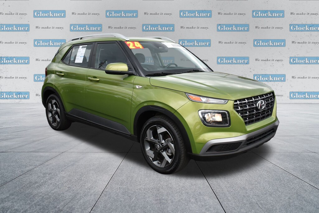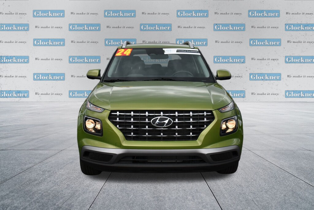 Glockner of Ironton is proud to offer this beautiful 2024 Hyundai Venue in Green Apple. This 2024 Hyundai Venue has passed our comprehensive inspection and comes with the following features; Option Group 01, Glockner Certified Certified, 4-Wheel Disc Brakes, 6 Speakers, 6.052 Axle Ratio, 6.5J x 17" Alloy Wheels, ABS brakes, Air Conditioning, Alloy wheels, AM/FM radio, Apple CarPlay & Android Auto, Auto High-beam Headlights, Automatic temperature control, Brake assist, Bumpers: body-color, Cargo Net, Cargo Tray, Carpeted Floor Mats, Cloth Seat Trim, Delay-off headlights, Driver door bin, Driver vanity mirror, Dual front impact airbags, Dual front side impact airbags, Electronic Stability Control, First Aid Kit, Front anti-roll bar, Front Bucket Seats, Front Center Armrest, Front reading lights, Front wheel independent suspension, Fully automatic headlights, Illuminated entry, Leather Shift Knob, Leather steering wheel, Low tire pressure warning, Occupant sensing airbag, Outside temperature display, Overhead airbag, Overhead console, Panic alarm, Passenger door bin, Passenger vanity mirror, Power door mirrors, Power moonroof, Power steering, Power windows, Radio: AM/FM/HD Display Audio, Rear Seat Cup Holder, Rear window defroster, Rear window wiper, Remote keyless entry, Roof rack: rails only, Security system, Speed control, Speed-sensing steering, Split folding rear seat, Spoiler, Steering wheel mounted audio controls, Tachometer, Telescoping steering wheel, Tilt steering wheel, Traction control, Trip computer, Variably intermittent wipers, and Wheel Locks.
