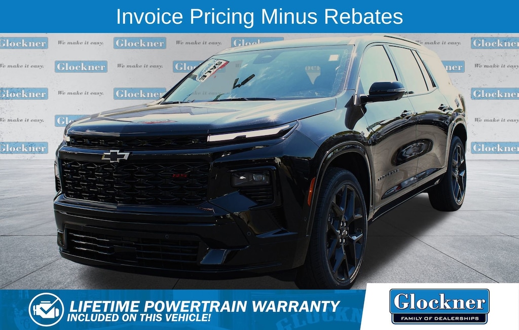 Glockner Chevrolet is proud to offer this outstanding-looking 2026 Chevrolet Traverse in Mosaic Black Metallic. This 2026 Chevrolet Traverse has passed our comprehensive inspection and comes with the following features; Preferred Equipment Group 1RS, Traverse RS, 4D Sport Utility, Mosaic Black Metallic, 12 Speakers, 3rd row seats: split-bench, 4-Wheel Disc Brakes, 6-Way Power Front Passenger Seat Adjuster, 8-Way Power Driver Seat Adjuster, ABS brakes, Air Conditioning, Alloy wheels, AM/FM radio: SiriusXM with 360L, Apple CarPlay/Android Auto, Auto High-beam Headlights, Auto tilt-away steering wheel, Auto-dimming door mirrors, Automatic temperature control, Bose Premium 12-Speaker Audio System Feature, Brake assist, Bumpers: body-color, Child-Seat-Sensing Airbag, Compass, Delay-off headlights, Driver 4-Way Power Lumbar Seat Adjuster, Driver door bin, Driver vanity mirror, Dual front impact airbags, Dual front side impact airbags, Electronic Stability Control, Emergency communication system: OnStar, Exterior Parking Camera Rear, Four wheel independent suspension, Front & Rear Painted Splash Guards (LPO), Front anti-roll bar, Front Bucket Seats, Front Center Armrest, Front dual zone A/C, Front Passenger 4-Way Power Lumbar Seat Adjuster, Front reading lights, Fully automatic headlights, Garage door transmitter, Heated door mirrors, Heated Driver & Front Passenger Seats, Heated front seats, Heated rear seats, Heated steering wheel, Illuminated entry, Low tire pressure warning, Memory seat, Navigation System, Occupant sensing airbag, Outside temperature display, Overhead airbag, Overhead console, Panic alarm, Passenger door bin, Passenger vanity mirror, Perforated Leather-Appointed Seat Trim, Power door mirrors, Power driver seat, Power Liftgate, Power passenger seat, Power steering, Power windows, Radio data system, Radio: Audio System w/17.7 Diagonal Display, Rain sensing wipers, Rear air conditioning, Rear anti-roll bar, Rear reading lights, Rear window defroster, Rear window wiper, Remote keyless entry, Security system, SiriusXM w/360L Trial Subscription, Speed control, Speed-sensing steering, Spoiler, Sport steering wheel, Steering wheel memory, Steering wheel mounted audio controls, Tachometer, Telescoping steering wheel, Tilt steering wheel, Traction control, Trip computer, Turn signal indicator mirrors, Variably intermittent wipers, Ventilated Driver & Front Passenger Seats, Ventilated front seats, Voltmeter, and Wheels: 22 High Gloss Black Painted Aluminum.