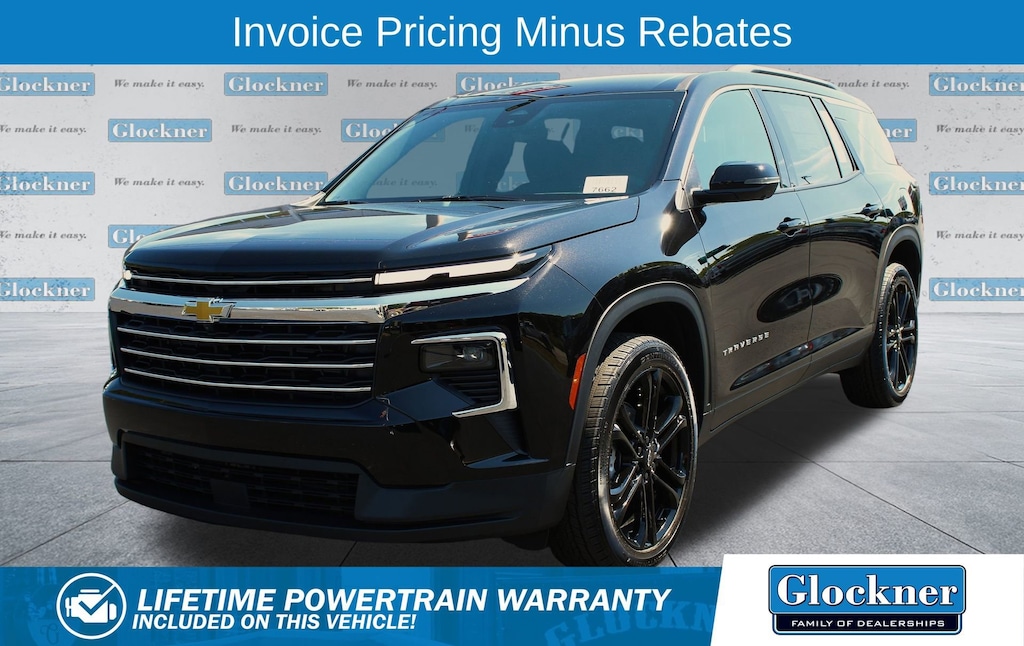 Glockner Chevrolet is proud to offer this charming 2026 Chevrolet Traverse in Mosaic Black Metallic. This 2026 Chevrolet Traverse has passed our comprehensive inspection and comes with the following features; Driver Confidence Package (HD Surround Vision, Key Card, Power Outlet, Rear Camera Mirror, Rear Pedestrian Alert, and Traffic Sign Recognition), Floor Liner Package (LPO) (1st & 2nd Row All-Weather Floor Liners (LPO), 3rd Row All-Weather Floor Liner (LPO), and Integrated Cargo Liner (LPO)), Traverse LT 1LT, 4D Sport Utility, 2.5L DOHC, FWD, 3rd row seats: split-bench, 4-Way Manual Front Passenger Seat Adjuster, 4-Wheel Disc Brakes, 6 Speakers, 6-Speaker Audio System Feature, 8-Way Power Driver Seat Adjuster, ABS brakes, Air Conditioning, Alloy wheels, AM/FM radio: SiriusXM with 360L, Apple CarPlay/Android Auto, Auto High-beam Headlights, Automatic temperature control, Black Lug Nut & Wheel Lock Kit (LPO), Brake assist, Bumpers: body-color, Child-Seat-Sensing Airbag, Compass, Delay-off headlights, Driver door bin, Driver vanity mirror, Dual front impact airbags, Dual front side impact airbags, Electronic Stability Control, Emergency communication system: OnStar, Four wheel independent suspension, Front anti-roll bar, Front Bucket Seats, Front Center Armrest, Front dual zone A/C, Front reading lights, Fully automatic headlights, Heated door mirrors, Heated Driver & Front Passenger Seats, Heated front seats, Heated steering wheel, Illuminated entry, Low tire pressure warning, Navigation System, Occupant sensing airbag, Outside temperature display, Overhead airbag, Overhead console, Panic alarm, Passenger door bin, Passenger vanity mirror, Power door mirrors, Power driver seat, Power Liftgate, Power steering, Power windows, Premium Cloth Seat Trim, Radio data system, Radio: Audio System w/17.7 Diagonal Display, Rear air conditioning, Rear anti-roll bar, Rear reading lights, Rear window defroster, Rear window wiper, Remote keyless entry, Security system, SiriusXM w/360L Trial Subscription, Special Ride & Handling Suspension, Speed control, Speed-sensing steering, Spoiler, Steering wheel mounted audio controls, Tachometer, Telescoping steering wheel, Tilt steering wheel, Traction control, Trip computer, Turn signal indicator mirrors, Variably intermittent wipers, Voltmeter, Wheels: 18 Grazen Metallic Machined-Face Aluminum, Wheels: 22 High Gloss Black Aluminum (LPO), and Wheels: 22 Transit.