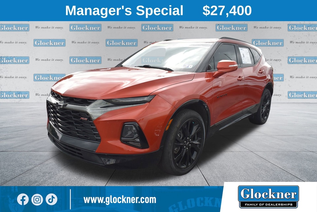 Glockner Chevrolet is proud to offer this wonderful-looking 2021 Chevrolet Blazer in Cayenne Orange Metallic. This 2021 Chevrolet Blazer has passed our comprehensive inspection and comes with the following features; Driver Confidence II Package (Adaptive Cruise Control, Enhanced Automatic Emergency Braking, HD Surround Vision, LED Headlamps, Rear Camera Mirror, Rear Camera Mirror Washer, Safety Alert Seat, and Wireless Charging), Enhanced Convenience Package (Heated Rear Outboard Seating Positions, Memory Settings For Driver Seat & Exterior Mirrors, Power Tilt & Telescoping Steering Column, and Ventilated Driver & Front Passenger Seats), Preferred Equipment Group 1RS, Trailering Equipment (Heavy-Duty Cooling System and Hitch Guidance), Blazer RS, Glockner Certified Certified, 4D Sport Utility, 3.6L V6 SIDI DOHC VVT, AWD, Cayenne Orange Metallic, 3.49 Final Drive Axle Ratio, 4-Wheel Disc Brakes, 6 Speakers, 6-Speaker Audio System Feature, 6-Way Power Front Passenger Seat Adjuster, ABS brakes, Air Conditioning, Alloy wheels, AM/FM radio: SiriusXM, Apple CarPlay/Android Auto, Auto High-beam Headlights, Auto-dimming door mirrors, Auto-dimming Rear-View mirror, Automatic temperature control, Brake assist, Bumpers: body-color, Child-Seat-Sensing Airbag, Compass, Delay-off headlights, Driver door bin, Driver vanity mirror, Dual front impact airbags, Dual front side impact airbags, Electronic Stability Control, Emergency communication system: OnStar and Chevrolet connected services capable, Exterior Parking Camera Rear, Four wheel independent suspension, Front anti-roll bar, Front Bucket Seats, Front Center Armrest, Front dual zone A/C, Front reading lights, Fully automatic headlights, Garage door transmitter, Heated door mirrors, Heated Driver & Front Passenger Seats, Heated front seats, Heated steering wheel, High-Intensity Discharge Headlights, Illuminated entry, Knee airbag, Leather Shift Knob, Low tire pressure warning, Navigation System, Occupant sensing airbag, Outside temperature display, Overhead airbag, Overhead console, Panic alarm, Passenger door bin, Passenger vanity mirror, Perforated Leather-Appointed Seat Trim, Power door mirrors, Power driver seat, Power Liftgate, Power Panoramic Tilt-Sliding Sunroof, Power passenger seat, Power steering, Power windows, Radio data system, Radio: Chevrolet Infotainment 3 Plus System, Rear anti-roll bar, Rear reading lights, Rear seat center armrest, Rear window defroster, Rear window wiper, Remote keyless entry, Ride & Handling Suspension, Security system, SiriusXM w/360L, Speed control, Speed-sensing steering, Split folding rear seat, Spoiler, Steering wheel mounted audio controls, Tachometer, Telescoping steering wheel, Tilt steering wheel, Traction control, Trip computer, Turn signal indicator mirrors, Variably intermittent wipers, Voltmeter, Wheels: 20 Dark Android Machined-Face Aluminum, and Wheels: 21 Gloss Black Aluminum.