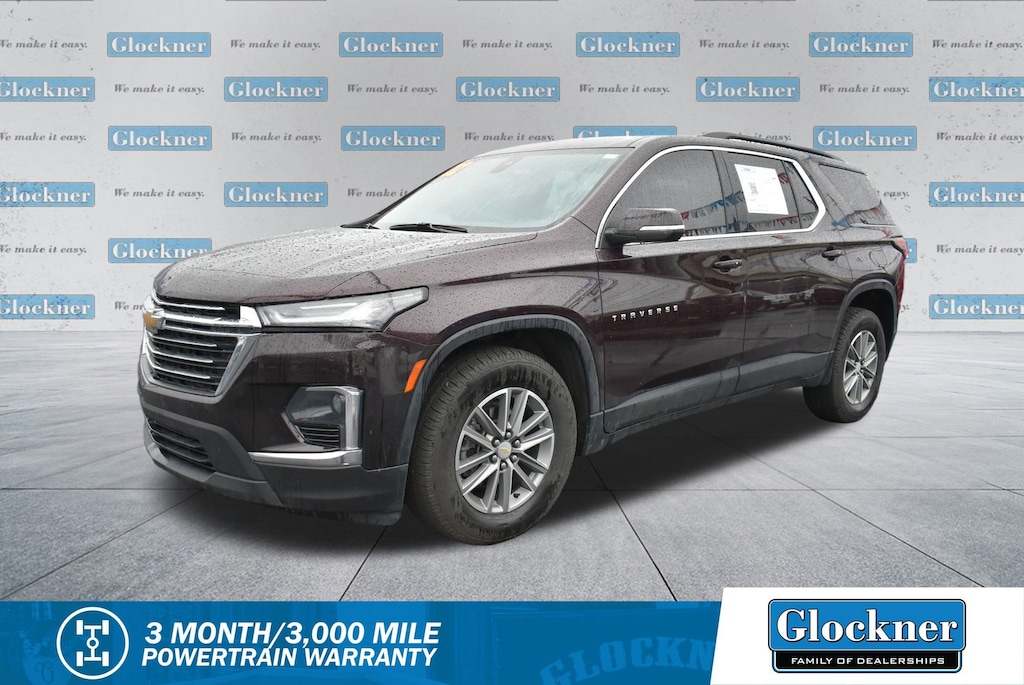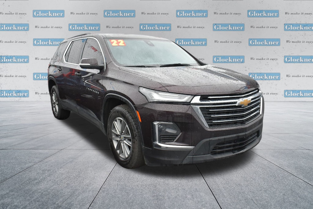 Glockner of Ironton is proud to offer this beautiful 2022 Chevrolet Traverse in Black Cherry Metallic. This 2022 Chevrolet Traverse has passed our comprehensive inspection and comes with the following features; Floor Liner Package (LPO) (1st & 2nd Row All-Weather Floor Liner (LPO), 3rd Row All-Weather Floor Liner (LPO), and Integrated Cargo Liner (LPO)), Preferred Equipment Group 1LT (Heated Driver & Front Passenger Seats and Rear Park Assist w/Audible Warning), AWD, 2-Way Manual Front Passenger Seat Adjuster, 3.49 Axle Ratio, 3rd row seats: split-bench, 4-Wheel Disc Brakes, 6 Speakers, 6-Speaker Audio System Feature, 8-Way Power Driver Seat Adjuster, ABS brakes, Air Conditioning, Alloy wheels, AM/FM radio: SiriusXM, Apple CarPlay/Android Auto, Auto High-beam Headlights, Automatic temperature control, Black Roof Rails, Brake assist, Bumpers: body-color, Compass, Delay-off headlights, Driver door bin, Driver vanity mirror, Dual front impact airbags, Dual front side impact airbags, Electronic Stability Control, Emergency communication system: OnStar Guidance, Exterior Parking Camera Rear, Four wheel independent suspension, Front anti-roll bar, Front Bucket Seats, Front Center Armrest, Front dual zone A/C, Front reading lights, Fully automatic headlights, Garage door transmitter, Heated door mirrors, Heated front seats, Illuminated entry, Leather steering wheel, Low tire pressure warning, Not Equipped w/Rear Park Assist, Occupant sensing airbag, Outside temperature display, Overhead airbag, Overhead console, Panic alarm, Passenger door bin, Passenger vanity mirror, Power door mirrors, Power Driver Lumbar Control, Power driver seat, Power Liftgate, Power steering, Power windows, Premium Cloth Seat Trim, Radio data system, Radio: Chevrolet Infotainment 3 Plus System, Rear air conditioning, Rear anti-roll bar, Rear reading lights, Rear window defroster, Rear window wiper, Remote keyless entry, Roof rack: rails only, Security system, SiriusXM w/360L, Speed control, Speed-sensing steering, Spoiler, Steering wheel mounted audio controls, Tachometer, Telescoping steering wheel, Tilt steering wheel, Traction control, Trip computer, Turn signal indicator mirrors, Variably intermittent wipers, Voltmeter, and Wheels: 18 Bright Silver-Painted Aluminum.AWD.