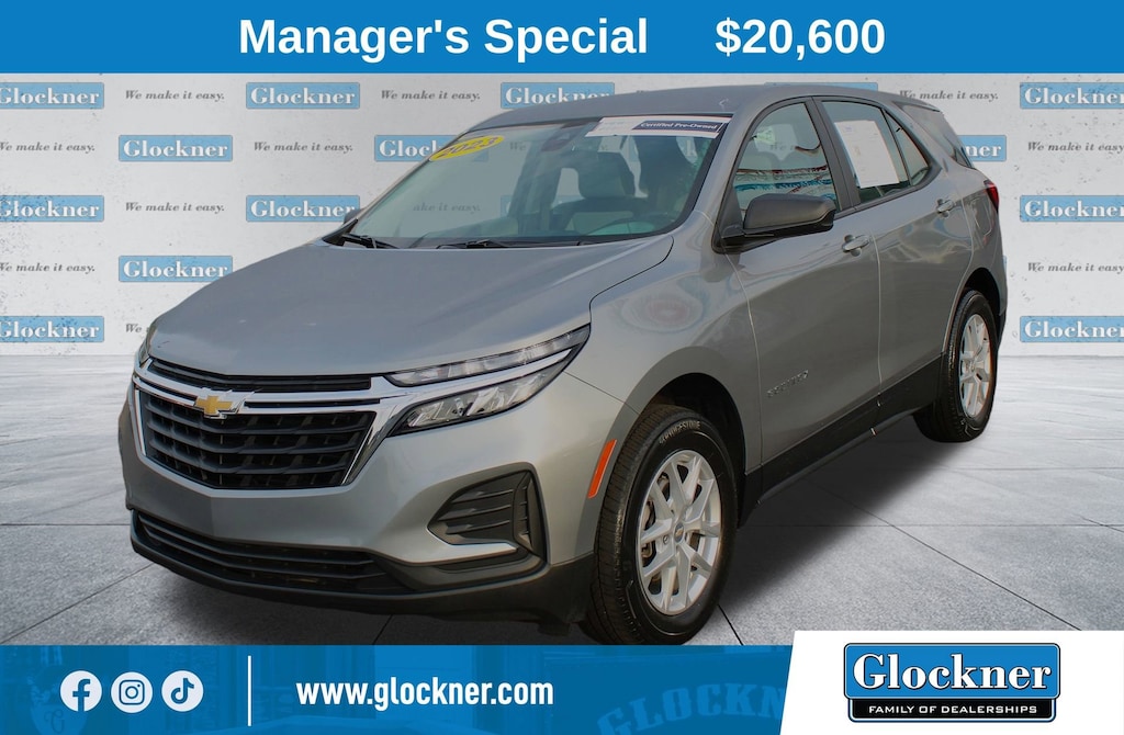 Glockner Chevrolet is proud to offer this beautiful-looking 2023 Chevrolet Equinox in Sterling Gray Metallic. This 2023 Chevrolet Equinox has passed our comprehensive inspection and comes with the following features; Driver Confidence II Package (Rear Park Assist w/Audible Warning), Preferred Equipment Group 1LS, Side Blind Zone & Rear Cross Traffic (Lane Change Alert w/Side Blind Zone Alert and Rear Cross Traffic Alert), Glockner Certified Certified, AWD, 17 Aluminum Wheels, 2 Rear USB Charging-Only Ports, 2 USB Ports & Auxiliary Input Jack, 3.87 Final Drive Axle Ratio, 4-Wheel Disc Brakes, 6 Speakers, 6-Speaker Audio System Feature, ABS brakes, Air Conditioning, Alloy wheels, AM/FM radio: SiriusXM, Auto High-beam Headlights, Bluetooth® For Phone, Brake assist, Bumpers: body-color, Compass, Delay-off headlights, Driver 4-Way Manual Seat Adjuster, Driver door bin, Driver vanity mirror, Dual front impact airbags, Dual front side impact airbags, Electronic Stability Control, Emergency communication system: OnStar and Chevrolet connected services capable, Four wheel independent suspension, Front anti-roll bar, Front Bucket Seats, Front Center Armrest, Front Passenger 4-Way Manual Seat Adjuster, Front reading lights, Fully automatic headlights, Heated door mirrors, Illuminated entry, Low tire pressure warning, Occupant sensing airbag, Outside temperature display, Overhead airbag, Overhead console, Panic alarm, Passenger door bin, Passenger vanity mirror, Power door mirrors, Power steering, Power windows, Premium audio system: Chevrolet Infotainment 3, Premium Cloth Seat Trim, Radio data system, Radio: Chevrolet Infotainment 3 System w/AM/FM, Rear anti-roll bar, Rear reading lights, Rear seat center armrest, Rear window defroster, Rear window wiper, Remote keyless entry, Security system, SiriusXM Radio, Speed control, Speed-sensing steering, Split folding rear seat, Spoiler, Steering wheel mounted audio controls, Tachometer, Telescoping steering wheel, Tilt steering wheel, Traction control, Trip computer, Variably intermittent wipers, and Wireless Apple CarPlay/Wireless Android Auto.