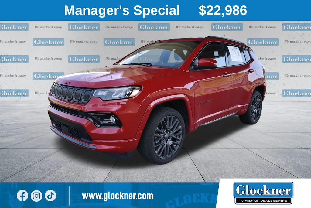 Glockner of Ironton is proud to offer this charming-looking 2022 Jeep Compass in Redline Pearlcoat. This 2022 Jeep Compass has passed our comprehensive inspection and comes with the following features; Glockner Certified Certified, 4WD, ABS brakes, Active Cruise Control, Alloy wheels, Compass, Electronic Stability Control, Front dual zone A/C, Heated door mirrors, Heated front seats, Illuminated entry, Low tire pressure warning, ParkView Rear Back-Up Camera, Passenger door bin, Remote keyless entry, Traction control, 10.1 Touchscreen Display, 3.73 Axle Ratio, 4-Wheel Disc Brakes, 6 Speakers, Air Conditioning, AM/FM radio: SiriusXM, Anti-whiplash front head restraints, Auto High-beam Headlights, Auto-dimming Rear-View mirror, Automatic temperature control, Brake assist, Bumpers: body-color, Delay-off headlights, Disassociated Touchscreen Display, Driver door bin, Driver vanity mirror, Dual front impact airbags, Dual front side impact airbags, Emergency communication system: SiriusXM Guardian, Four wheel independent suspension, Front anti-roll bar, Front Bucket Seats, Front Center Armrest w/Storage, Front fog lights, Front reading lights, Fully automatic headlights, Global Telematics Box Module (TBM), Gloss Black Exterior Mirrors, Heated steering wheel, Knee airbag, Leather Shift Knob, Leather Trimmed Bucket Seats, Occupant sensing airbag, Outside temperature display, Overhead airbag, Overhead console, Panic alarm, Passenger vanity mirror, Power door mirrors, Power driver seat, Power steering, Power windows, Radio: Uconnect 5 w/10.1 Display, Rain sensing wipers, Rear anti-roll bar, Rear seat center armrest, Rear window defroster, Rear window wiper, Roof rack: rails only, Security system, Speed control, Split folding rear seat, Spoiler, Steering wheel mounted audio controls, Tachometer, Telescoping steering wheel, Tilt steering wheel, Trip computer, Turn signal indicator mirrors, Variably intermittent wipers, and Wheels: 18 x 7 Painted Diamond Cut Aluminum.