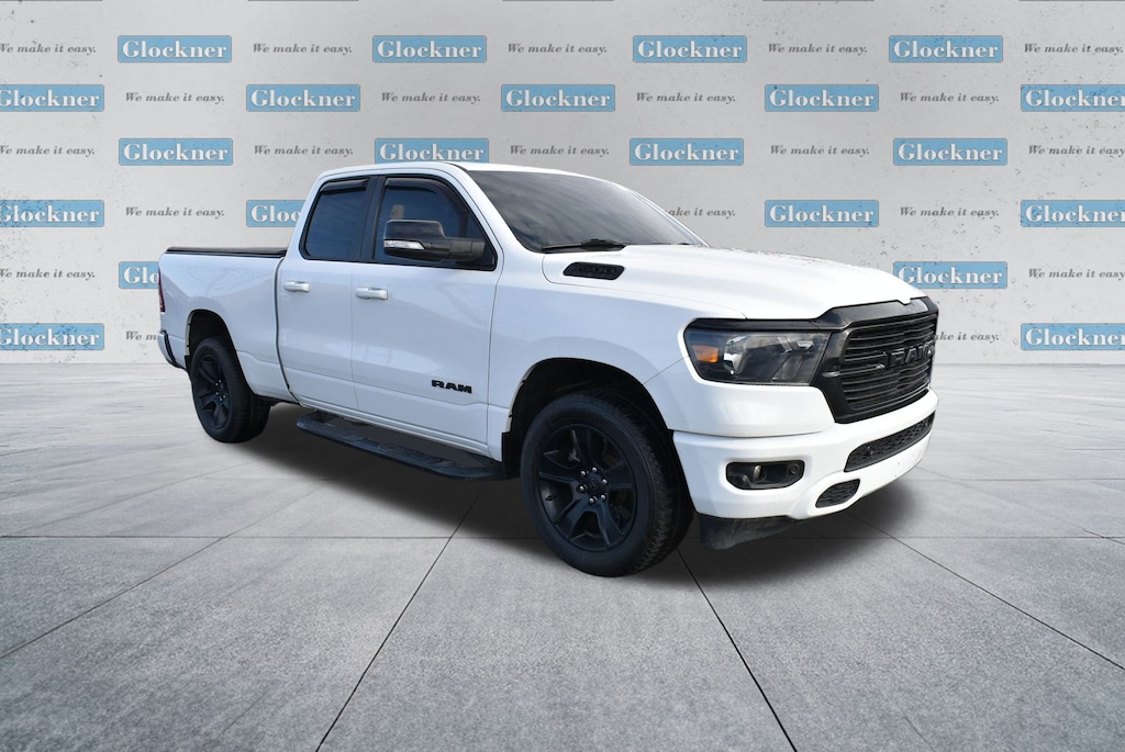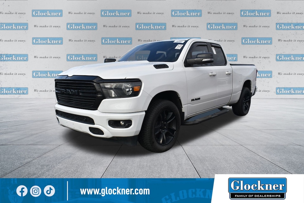 Glockner Chrysler Dodge Jeep Ram of Ashland is proud to offer this wonderful 2021 Ram 1500 in Bright White Clearcoat. This 2021 Ram 1500 has passed our comprehensive inspection and comes with the following features; Big Horn Level 2 Equipment Group (115V Auxiliary Power Outlet, 115V Auxiliary Rear Power Outlet, 400W Inverter, Air Conditioning ATC w/Dual Zone Control, Auto-Dimming Exterior Driver Mirror, Auto-Dimming Rear-View Mirror, Black Premium Power Mirrors, Class IV Receiver Hitch, Cluster 7.0" TFT Color Display, Exterior Mirrors Courtesy Lamps, Exterior Mirrors w/Supplemental Signals, Foam Bottle Insert (Door Trim Panel), For More Info, Call 800-643-2112, Glove Box Lamp, Heated Front Seats, Heated Steering Wheel, Media Hub w/2 Charge Only USBs, ParkSense Front/Rear Park Assist w/Stop, Power 4-Way Driver Lumbar Adjust, Power 8-Way Driver Seat, Power Adjustable Pedals, Power-Folding Mirrors, Rear Dome w/On/Off Switch Lamp, Rear Power Sliding Window, Rear Window Defroster, Security Alarm, SiriusXM Radio Service, Sun Visors w/Illuminated Vanity Mirrors, and Universal Garage Door Opener), Night Edition (3 Rear Seat Head Restraints, 4 Way Front Headrests, Anti-Spin Differential Rear Axle, Black Exterior Truck Badging, Black Headlamp Bezels, Black Interior Accents, Body Color Front Bumper, Body Color Rear Bumper w/Step Pads, Bucket Seats, Center Console Parts Module, Deluxe Cloth Bucket Seats, Dual Exhaust w/Black Tips, Exterior Mirrors w/Memory, Front Seat Back Map Pockets, Full Length Floor Console, Manual Adjust 4-Way Front Passenger Seat, Rear 60/40 Folding Seat, and Wheels: 20" x 9.0" Premium Paint/Polished), Quick Order Package 25Z Big Horn (Big Horn Badge), Trailer Tow Group (Add Class IV Receiver Hitch, Trailer Brake Control, Trailer Light Check, Trailer Reverse Steering Control, and Trailer Tire Pressure Monitoring System), 4-Wheel Disc Brakes, 40/20/40 Split Bench Seat, 48V Belt Starter Generator, 6 Speakers, ABS brakes, Air Conditioning, Alloy wheels, AM/FM radio, Black Exterior Mirrors, Brake assist, Bumpers: chrome, Cloth Bench Seat, Compass, Delay-off headlights, Driver door bin, Dual front impact airbags, Dual front side impact airbags, Electronic Stability Control, Front anti-roll bar, Front Center Armrest w/Storage, Front fog lights, Front License Plate Bracket, Front reading lights, Front wheel independent suspension, Fully automatic headlights, GPS Antenna Input, Heated door mirrors, Illuminated entry, Integrated Voice Command w/Bluetooth, Leather steering wheel, Low tire pressure warning, Occupant sensing airbag, Outside temperature display, Overhead airbag, Overhead console, Panic alarm, ParkView Rear Back-Up Camera, Passenger door bin, Passenger vanity mirror, Power door mirrors, Power steering, Power windows, Radio data system, Radio: Uconnect 3 w/5" Display, Radio: Uconnect 4 w/8.4" Display, Rear anti-roll bar, Rear seat center armrest, Rear step bumper, Remote keyless entry, Remote Start System, Speed control, Split folding rear seat, Steering wheel mounted audio controls, Tachometer, Telescoping steering wheel, Tilt steering wheel, Traction control, Trip computer, Variably intermittent wipers, Voltmeter, and Wheels: 18" x 8" Cast-Aluminum Painted.