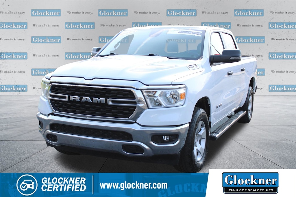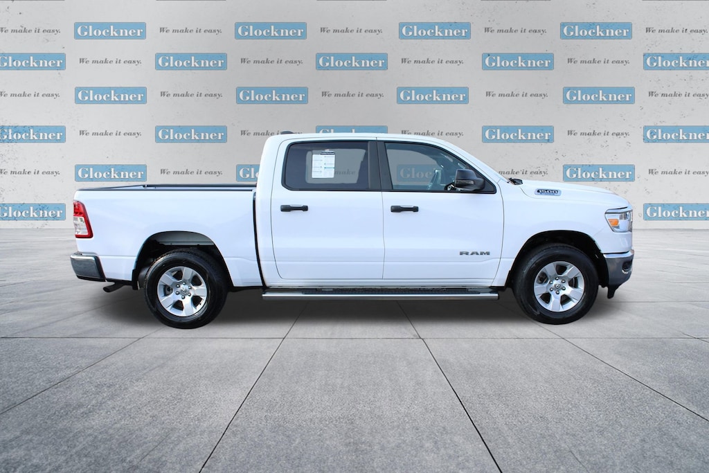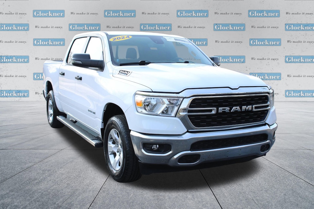 Glockner Chevrolet is proud to offer this good-looking 2024 Ram 1500 in Bright White Clearcoat. This 2024 Ram 1500 has passed our comprehensive inspection and comes with the following features; Big Horn Level 1 Equipment Group (2nd Row In Floor Storage Bins, 4G LTE Wi-Fi Hot Spot, Apple CarPlay, Auto-Dimming Exterior Driver Mirror, Auto-Dimming Rear-View Mirror, Black Premium Power Mirrors, Bluetooth Handsfree Phone & Audio, Class IV Receiver Hitch, Connectivity - US/Canada, Convex Wide-Angle Exterior Mirror Insert, Electric Shift-On-Demand Transfer Case, Exterior Mirrors Courtesy Lamps, Exterior Mirrors w/Heating Element, Exterior Mirrors w/Supplemental Signals, For Details, Visit DriveUconnect.com, For More Info, Call 800-643-2112, Front Fog Lamps, Global Telematics Box Module (TBM), Glove Box Lamp, Google Android Auto, Heated Front Seats, Heated Steering Wheel, Passenger Sun Visor w/Illuminated Mirror, Power-Folding Mirrors, Radio: Uconnect 5 W w/8.4 Display, Rear Dome w/On/Off Switch Lamp, Rear Power Sliding Window, Rear Window Defroster, SiriusXM Radio Service, SiriusXM Satellite Radio, and USB Host Flip), Quick Order Package 23Z Big Horn (Big Horn Badge), Glockner Certified Certified, 3 Rear Seat Head Restraints, 3.21 Rear Axle Ratio, 4 Way Front Headrests, 4-Wheel Disc Brakes, 48V Belt Starter Generator, 6 Speakers, ABS brakes, Air Conditioning, Alloy wheels, AM/FM radio, Brake assist, Bumpers: chrome, Cloth Bench Seat, Compass, Delay-off headlights, Driver door bin, Dual front impact airbags, Dual front side impact airbags, Electronic Stability Control, Emergency communication system: RAM Connect, Front anti-roll bar, Front Center Armrest w/Storage, Front License Plate Bracket, Front reading lights, Front Seat Back Map Pockets, Front wheel independent suspension, Fully automatic headlights, Heated door mirrors, Illuminated entry, Integrated Voice Command w/Bluetooth, Leather steering wheel, Low tire pressure warning, MOPAR Front & Rear Rubber Floor Mats, Occupant sensing airbag, Outside temperature display, Overhead airbag, Overhead console, Panic alarm, ParkView Rear Back-Up Camera, Passenger door bin, Passenger vanity mirror, Power door mirrors, Power steering, Power windows, Radio data system, Radio: Uconnect 3 w/5 Display, RAM Grille Badge - Chrome, Rear 60/40 Folding Seat, Rear anti-roll bar, Rear seat center armrest, Rear step bumper, Remote keyless entry, Speed control, Split folding rear seat, Steering wheel mounted audio controls, Tachometer, Telescoping steering wheel, Tilt steering wheel, Traction control, Trip computer, Variably intermittent wipers, Voltmeter, and Wheels: 18 x 8 Cast-Aluminum PainteD.
